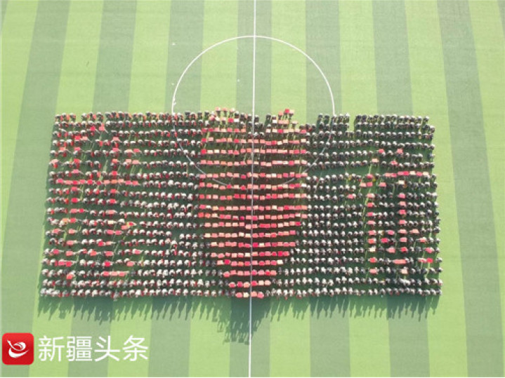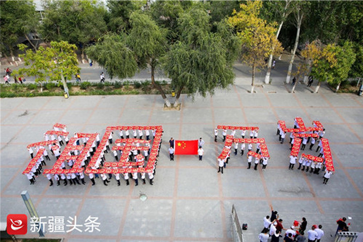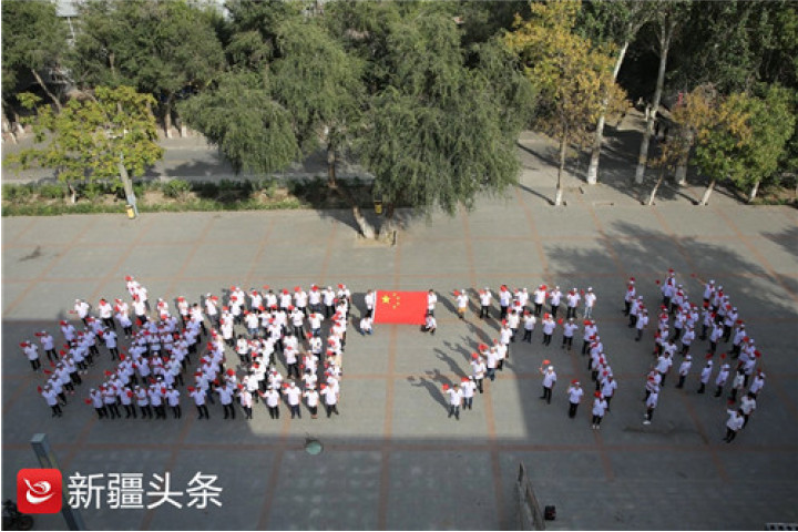 新疆头条讯(记者董潇涵)为庆祝中华人民共和国成立70周年,新疆各高校内喜庆氛围浓厚,处处响起祝福祖国的歌声,一抹“中国红”也成为校园里最美的色彩。在操场、教学楼前,师生们纷纷手拿国旗,列队组成“70”“中国”“爱心”等元素的造型,来表达他们对祖国的热爱和诚挚地祝福。