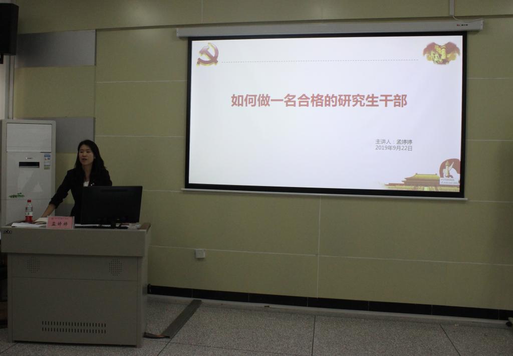孟婷婷以《如何做一名合格的研究生干部》为题,作了专题讲座,围绕研究生干部如何坚定理想信念保持工作热情、如何勇担使命创造性开展工作、怎样加强学习时刻引领广大研究生等方面进行了详细解读。