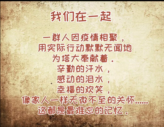 一群人,因疫情相聚,用实际行动默默无闻地为塔大奉献着,辛勤的汗水,感动的泪水,幸福地欢笑,像家人一样无微不至的关怀,这都是最难忘的记忆......