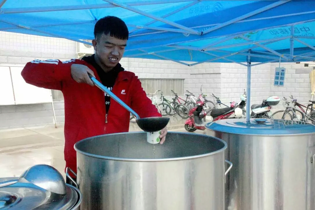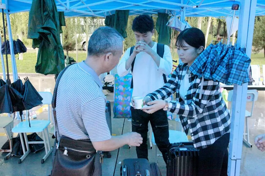 倾盆大雨,寒气迫人,后勤准备了姜汤为新生和家长驱散寒意。(图为志愿者为刚到的新生与家长派发姜汤)