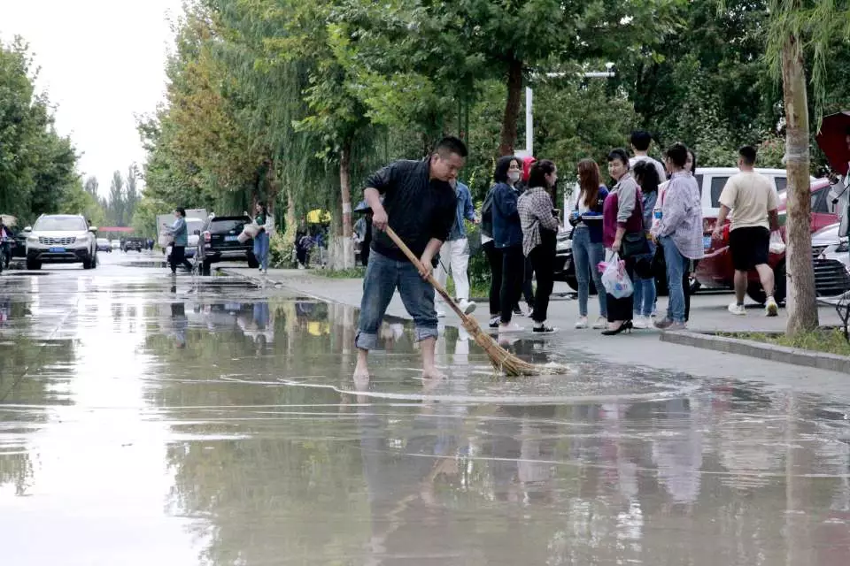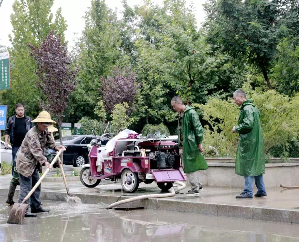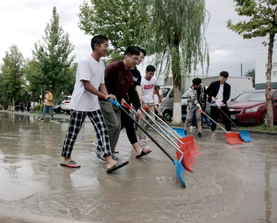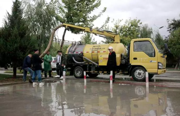 连绵的大雨致使学校多处路面积水,为保障迎新工作的顺利进行,同时确保我校其他工作的正常开展,我校后勤处冒着大雨紧急抽调大型吸污车一台,抽水泵五台,同时出动后勤保障人员80人,学生志愿者40人,前往学校各处积水路面进行清理。他们从上午十一点一直奋战到中午三点,清理学校的积水。
