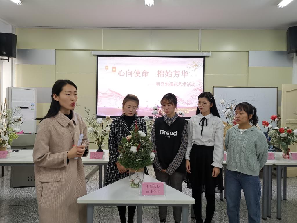 10月20日,我校研究生开展“心向使命,棉始芳华”主题教育艺术插花活动。党委研究生工作部部长高庆华、副部长孟婷婷,辅导员、各学院教学秘书及研究生参加活动。