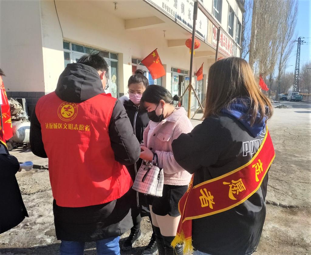 工商管理类2019级1班张月茹同学积极响应号召,在乌鲁木齐市达坂城区奉献出自己的一份力量。志愿服务期间,她为居民测量体温、登记出入人员信息、为进出的车辆消毒等,以实际行动守护居民的生命安全和身体健康。