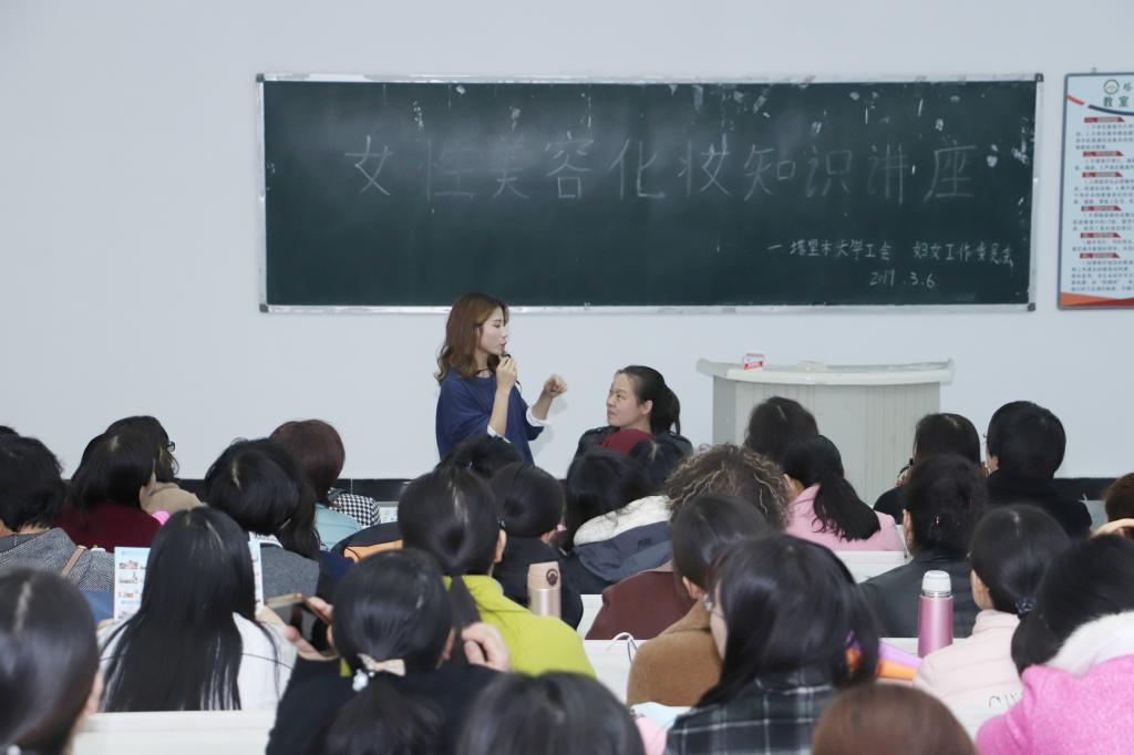 在第109个“三八”国际妇女节来临之际,为丰富学校女教职工的美妆知识和提升职业形象,3月6日下午,校工会、妇委会在综合楼阶教二举办女教职工美容化妆知识讲座。各学院、各部门近100名女教职工聆听讲座。校工会、妇委会为参加讲座的每位女教职工送上了节日的鲜花和祝福。