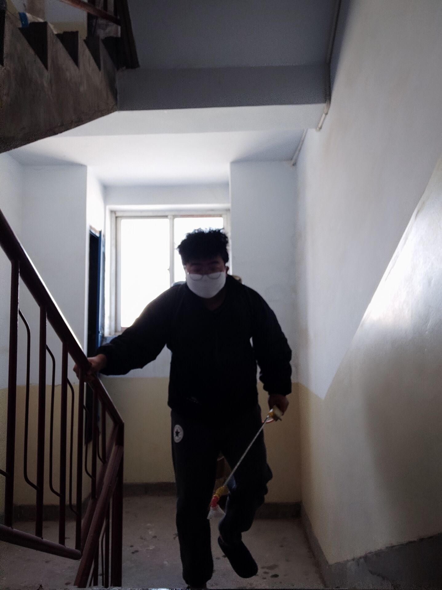 食品质量与安全2019级1班的曹家斌全副武装,与村里的志愿者们一起,背上几十斤重的消毒设备,为甘肃省张掖市先锋村居民楼消毒。