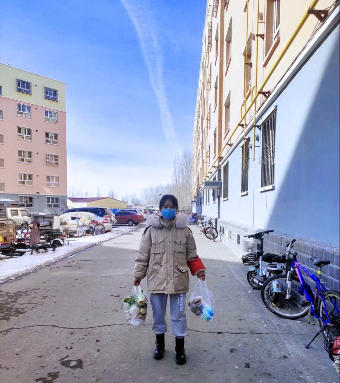 卡其色外套蓝色医用口罩,胳膊上挂着志愿者标志,这是食品质量与安全2019级1班的团支书萨丽玛同学的抗疫身影。在向组织申请后,她成功加入志愿者队伍,负责塔城额敏县盛世景苑居民们的日常生活所需的采购与运送,扛起为居民生活服务的责任担当。