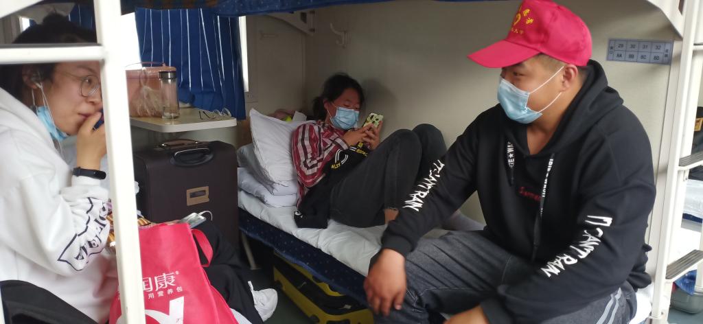 “上车前领取了专列车票,和同学们一起唱《我和我的祖国》《光荣塔大》,我感到十分自豪和骄傲。在上车前我打电话给父母报了个平安、和小伙伴们打电话告了个别。一路上,虽然有点累,但我很兴奋、很激动。很享受此次的乘车之旅,除了吃、睡外,还和小伙伴聊天,认识到了很多有趣的朋友,我很开心,也很安心。静等今晚返回我向往已久的塔大,很期待开始新的校园学习生活。”汉语言文学2019级冉文博同学说。
