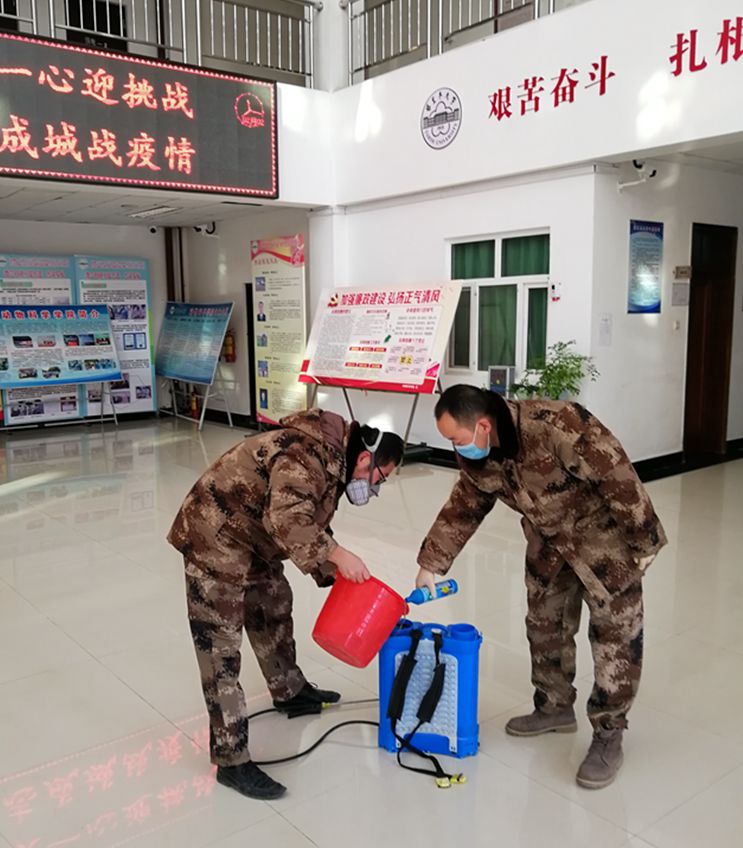 2月16日,顾不上午休,动科院实验中心主任焦海宏老师,背着30公斤的消毒喷雾器在办公楼楼里消毒。楼梯、窗户、门把手、扶手......他不放过楼道里的每个卫生死角。