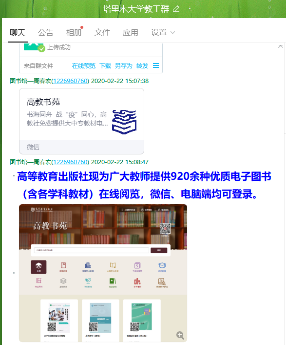 科研文献”微信服务群等,持续引导师生们在线使用图书馆数字资源和文献,保障师生对文献信息的需求。采访编目部积极联系高等教育出版社、清华大学出版社、机械工业出版社等教材出版机构,为教师开通“文泉学堂”、“高教书苑”等电子教材使用权限,有效解决教师备课教材和参考书籍不足的困难。