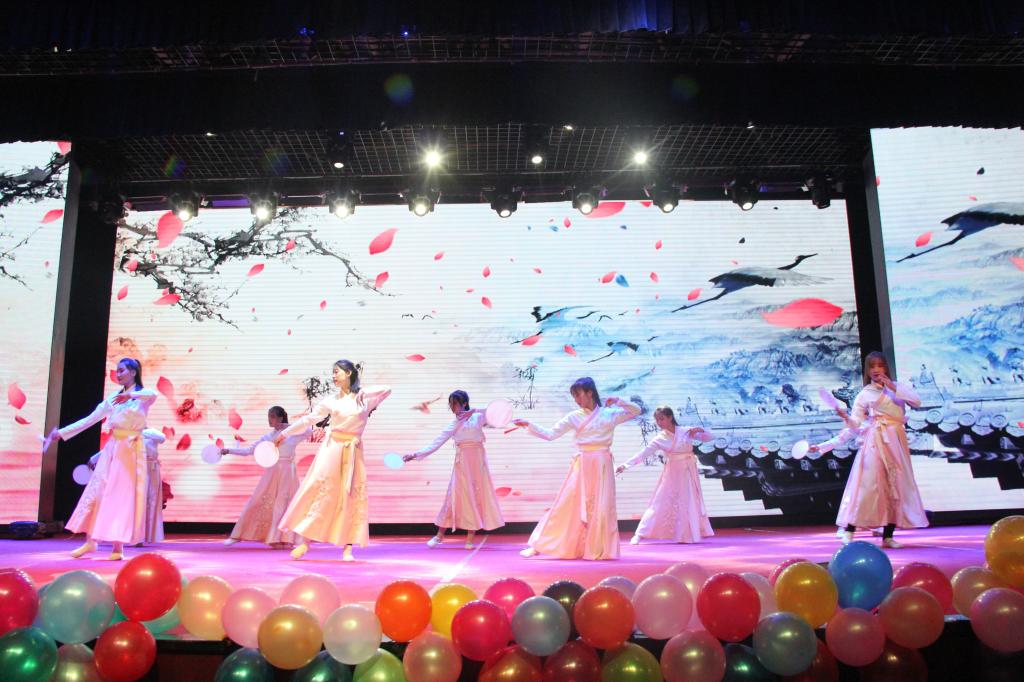 开场舞《牡丹花开》拉开了晚会的序幕。第一篇章——乐颂中国·永恒礼赞,通过舞蹈以及舞台剧《华妆璀璨·不忘昔年》表达了对祖国的歌颂。第二篇章——蝶舞青春·行远思恩,通过歌曲串烧、手影舞、心理剧、舞蹈展现了信息学子的青春活力。第三篇章——不忘育人初心、牢记戍边使命,通过舞蹈、乐器、朗诵,歌曲诠释了信息学子不忘初心、牢记使命,发扬胡杨精神。