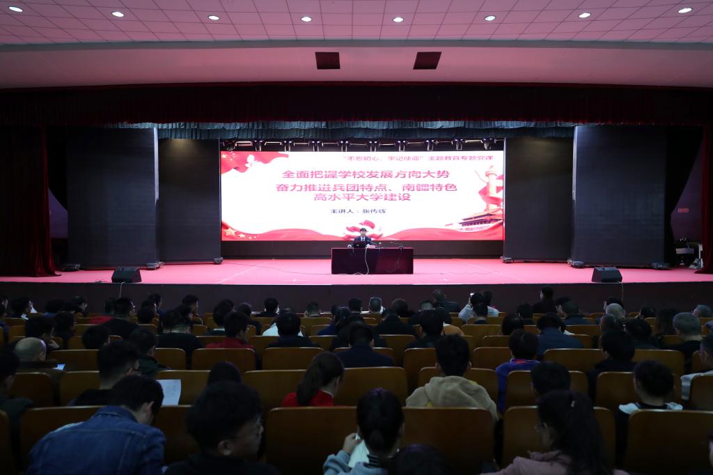 根据学校“不忘初心、牢记使命”主题教育实施方案,11月20日下午,党委副书记、校长张传辉给师生党员上主题教育专题党课。全体在校校领导,兵团第一巡回指导组成员,副处级以上干部,师生党员1000余人听取党课。党课在行政楼报告厅举行。