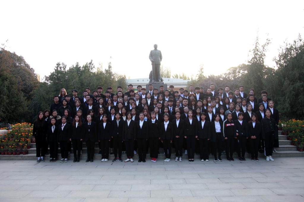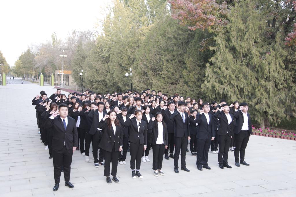 全媒体中心全体学生记者133人,面对王震将军铜像,举起右拳庄严宣誓。