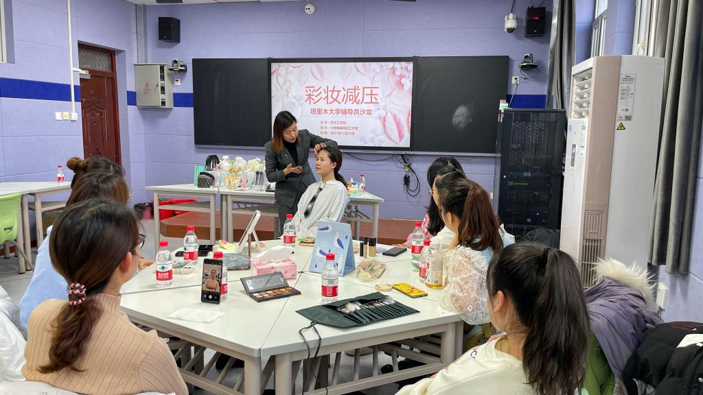 为加强辅导员队伍建设,提高辅导员队伍工作能力,帮助辅导员缓解工作压力,12月31日下午,由学工部主办、“小胡杨”辅导员工作室承办的第二期辅导员减压沙龙在综合楼128教室举办。本期沙龙以“‘化’解压力,‘妆’点人生”为主题,由工作室负责人李丹丹主持,30余名女辅导员参加。