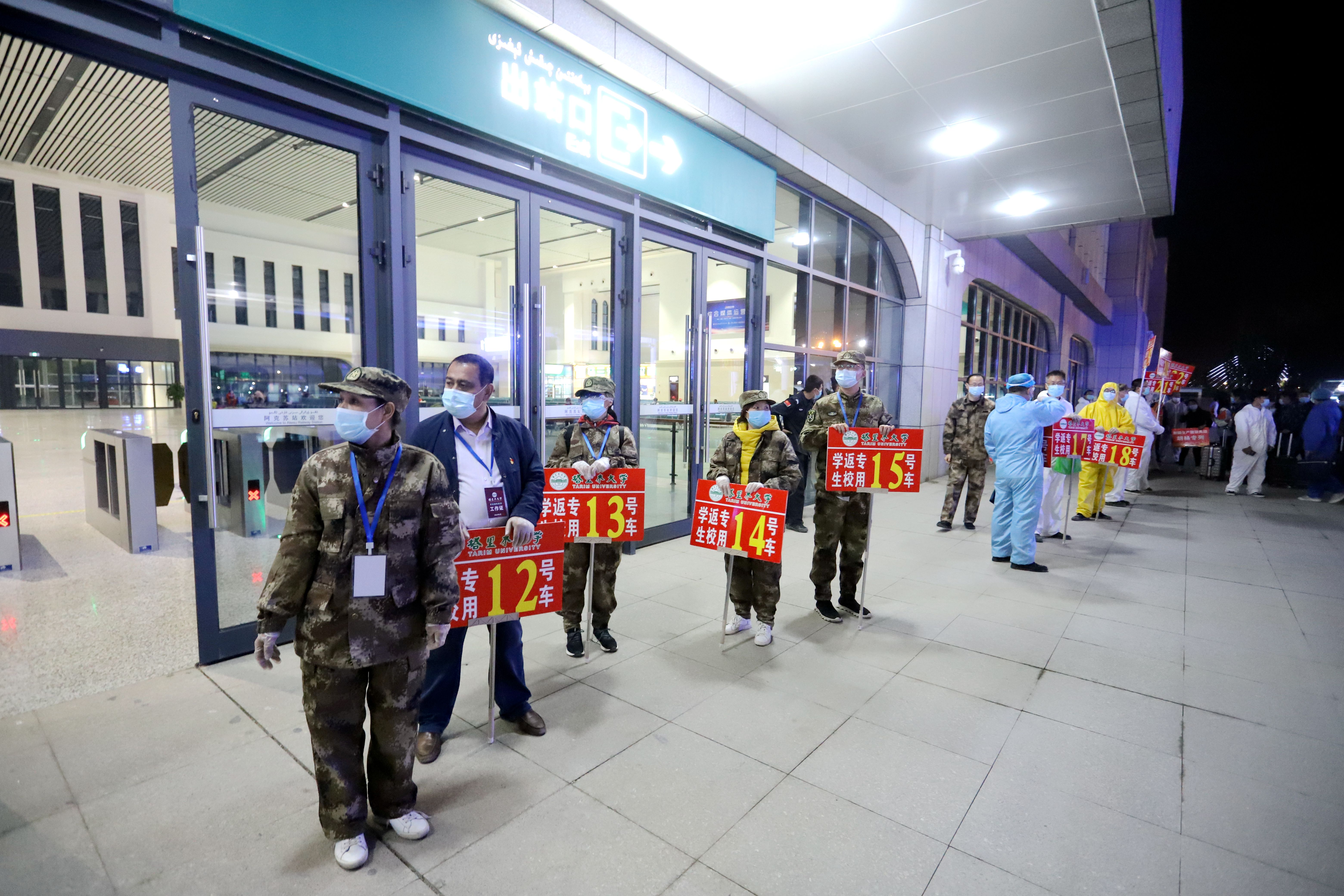 “前方到站,是阿克苏车站,始发兰州的兵团返校复学胡杨专列就要进站了……”封闭不了的爱,隔离不住的情。疫情挡不住春天的脚步,挡不住开往南疆的返校复学兵团专列。