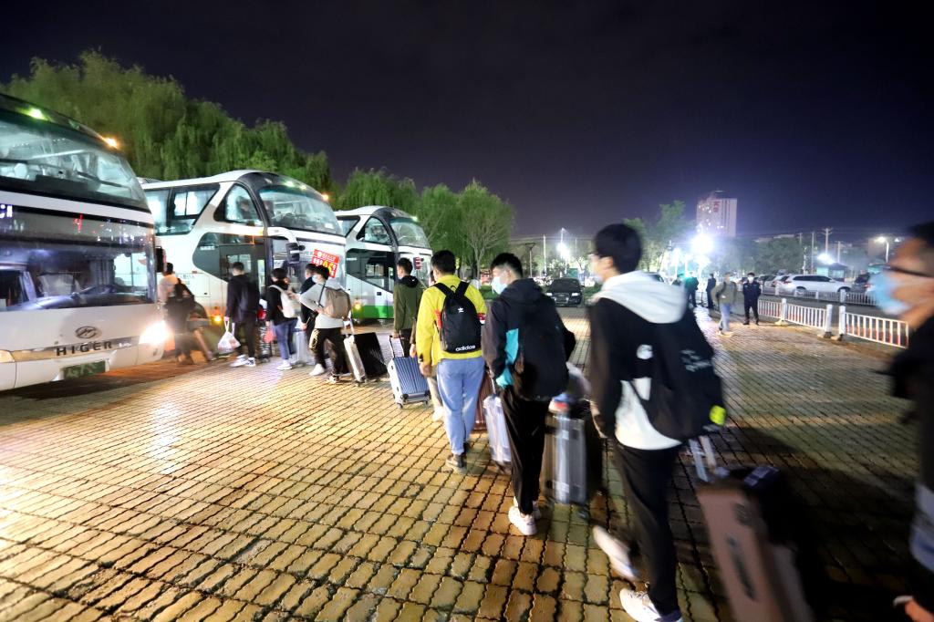 同学们排队登上大巴车,离开阿克苏火车站,前往阿拉尔市,27辆大巴专运、10辆警车60多名警察全程护航。