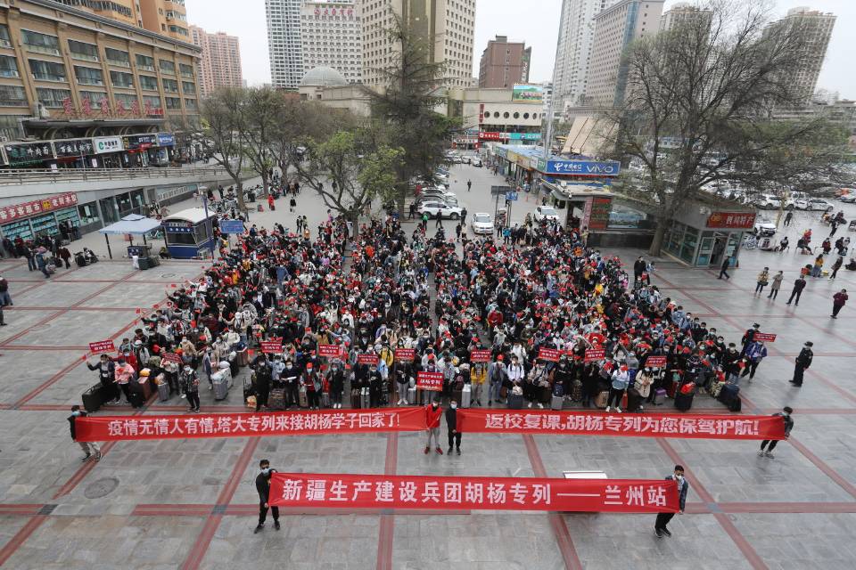 在兰州火车站,同学们整齐列队,手举小红旗,齐声高唱《我和我的祖国》《光荣塔大》,难掩心中的激动和喜悦。