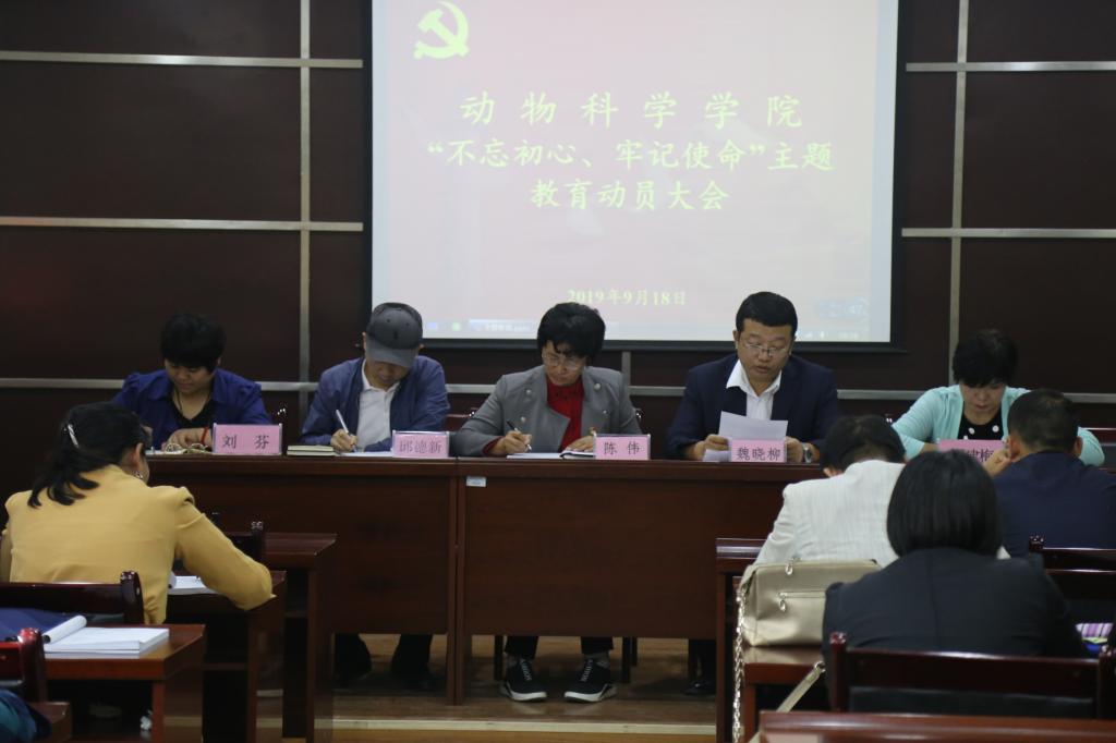 为确保主题教育扎实推进,出成果、见成效,按照学校主题教育领导小组要求,9月18日下午,动物科学学院组织召开“不忘初心、牢记使命”主题教育动员大会。学校主题教育领导小组办公室第一指导组组长张理到会指导。学院党委副书记、院长陈伟,党委副书记魏晓柳,副院长邱德新,以及全体师生党员参加。会议由魏晓柳主持,在学院218会议室召开。