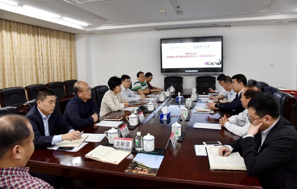 刘雅红代表华南农业大学党委对赵光辉、卢光志一行到访表示热烈欢迎,介绍了华南农业大学近年来的发展情况,重点介绍了华南农业大学高水平大学建设情况加强“双一流”建设情况,回顾了两校交流合作情况。她强调,华南农业大学愿意为祖国边疆的乡村振兴、脱贫攻坚,特别是为塔大未来建设发展提供更大支持帮助。
