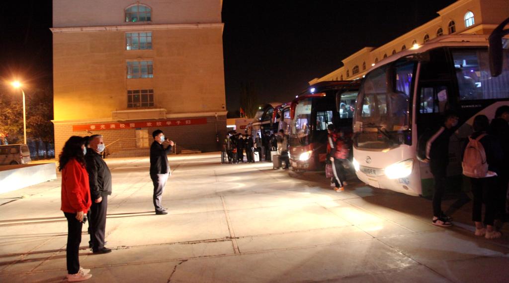 凌晨2:00,载着1086名返校胡杨学子的大巴车,缓缓驶进学校正南门,同学们坐在车上不停地,向站在大门口等待的领导干部们挥手示意。