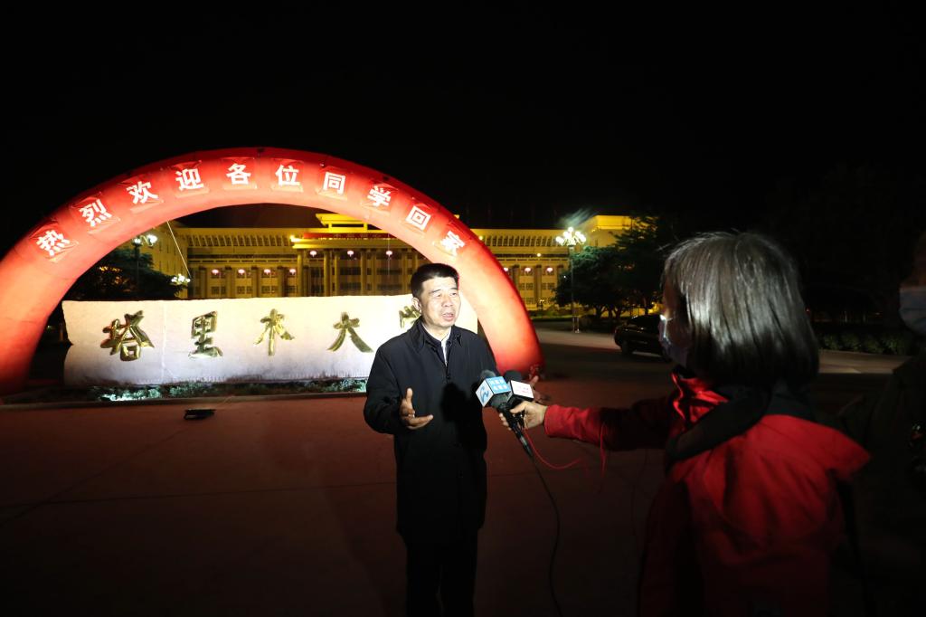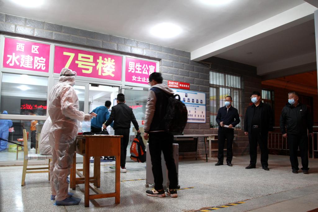大巴车驶入学生生活区,校领导分组来到东、西区学生公寓,现场指挥协调和检查指导学生入宿登记、防疫检测等各项工作,确保学生的生命安全和身体健康,确保学生返校复课和疫情防控工作有力有序有效开展。