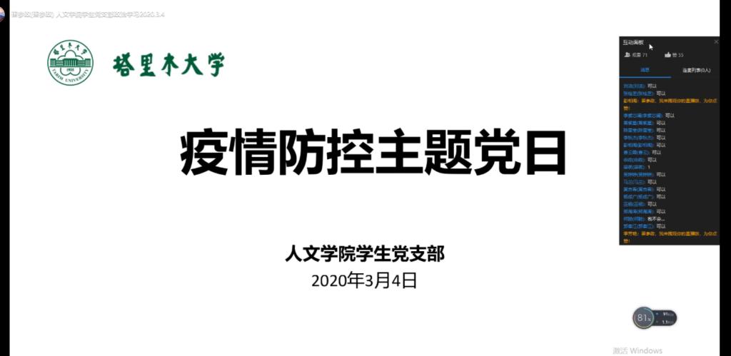 活动伊始,播放了校歌《光荣塔大》。随后,学习总书记关于疫情防控工作的重要讲话和重要指示精神,学习在抗疫一线的党员先进事迹,观看了中国人民大学金灿荣教授讲授的《国际角度看中国战“疫”》。