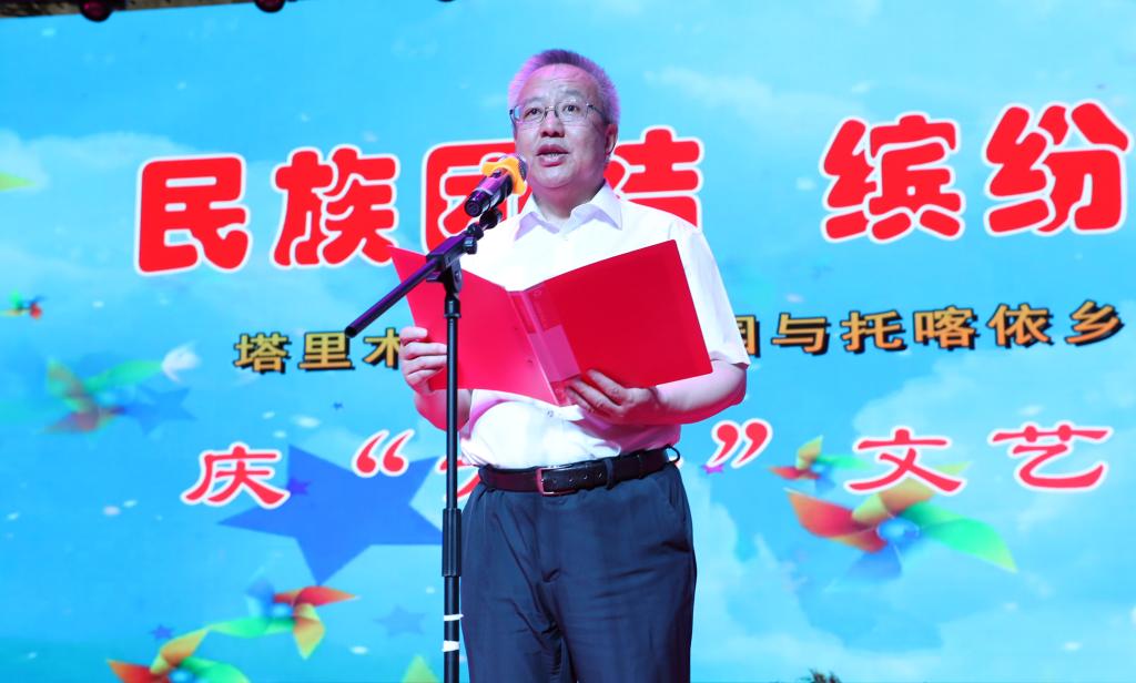 节目伊始,曲义勇发表了热情洋溢的致辞,代表学校党委和全体师生向小朋友们送上节日的祝福。希望幼儿园不忘初心,牢记使命,继续用胡杨精神育人,努力培养孩子们的品德修养和学识修养,扣好了孩子们人生的第一粒扣子,让每个孩子都能健康成长。希望小朋友们从小树立远大的志向和崇高的理想信念,养成良好的道德品质和文明习惯,早日成为有理想、有道德、有文化、有纪律的一代新人。希望学校幼儿园与托喀依乡幼儿园继续手拉手,齐步往前走,使民族团结的种子根植于各民族小朋友的心田,使民族团结之花越开越艳。