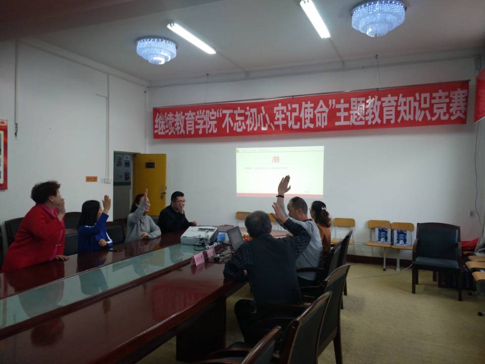 继续教育学院党总支响应学校党委关于深入推进“不忘初心、牢记使命”主题教育,持续抓好理论武装,坚定理想信念,强化党性修养,确保理论学习有收获、思想政治受洗礼、干事创业敢担当、为民服务解难题、清正廉洁作表率。学院党总支于12月22日下午,在1号教学楼204会议室举办“不忘初心、牢记使命”主题教育知识竞赛。