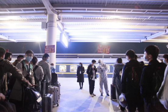 疆外返校学生下了火车,张莉莉上前与同学们亲切交谈,热烈欢迎同学们回家。叮嘱同学们要积极配合学校,做好个人防护,认真学好网课,安排好校园生活。