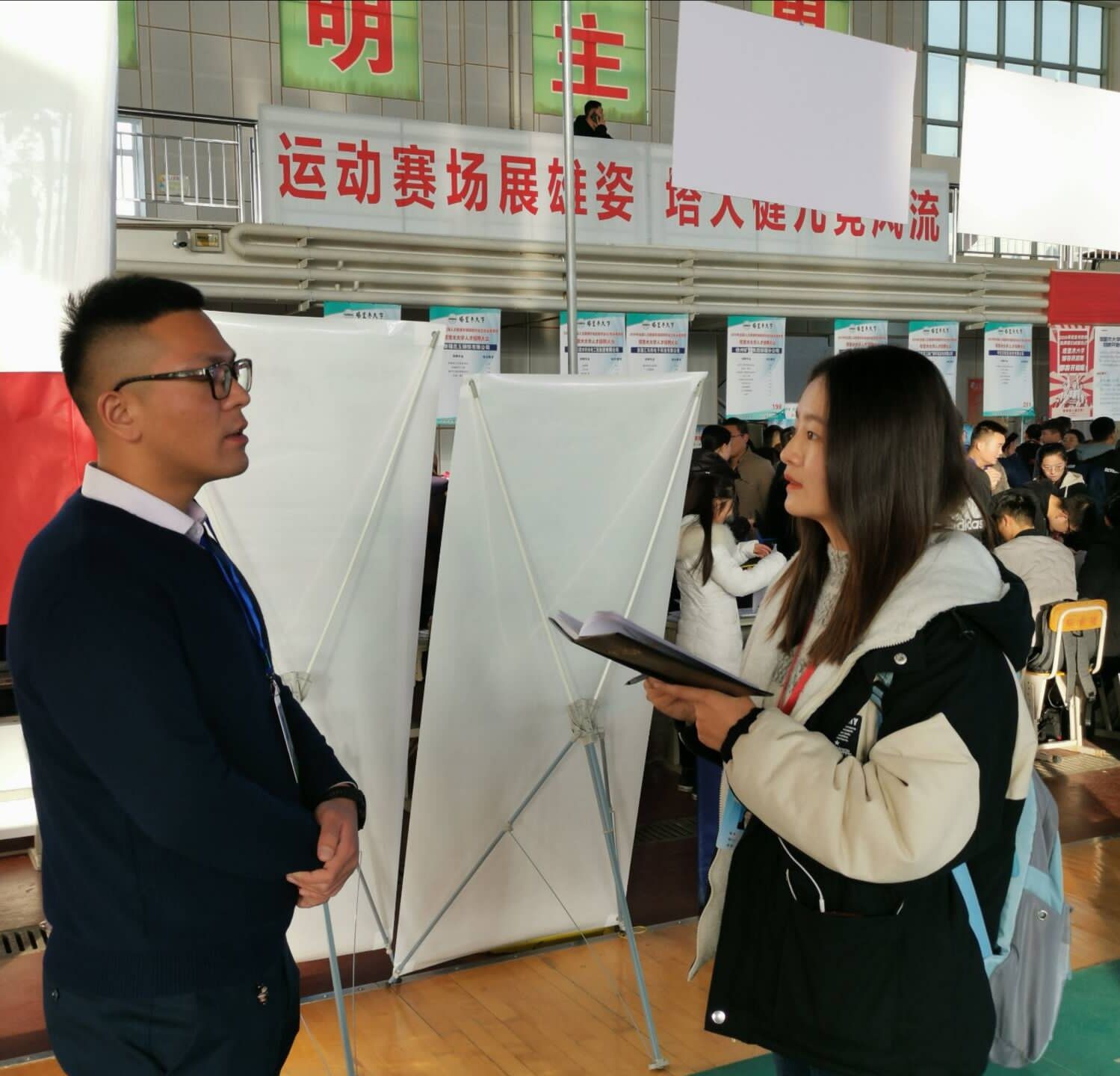 张咏玲:看到今天人潮涌动的招聘现场,作为毕业班班主任,你有什么感想呢?您对我院的毕业生在求职方面有什么建议吗?