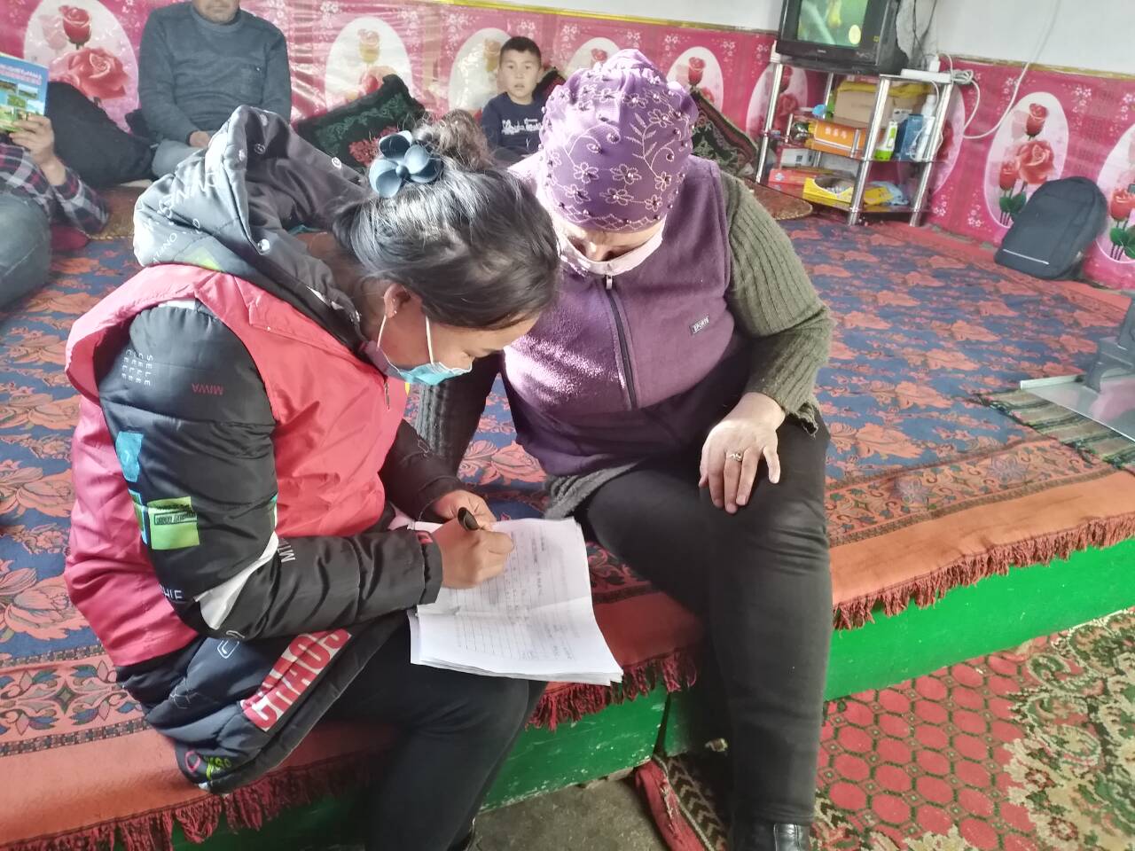 她每天早晨10:30联系负责人,便开始了工作。表格、一支笔、一幅口罩、一件鲜艳的红色马甲是她的基本标配,村子被大雪山笼罩,虽然路滑走路不方便,但阻止不了她对这份工作的热爱。每天走3-4公里,入66户人家,了解每一个村民身体情况,认真填写相关表格。