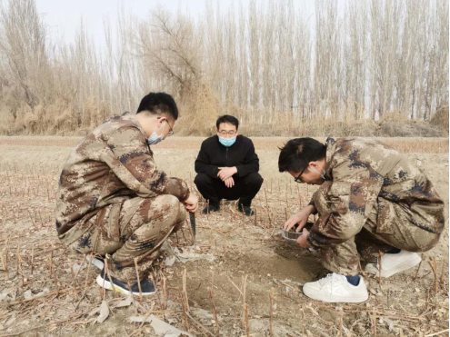 在兵团农业局残膜污染治理整团推进计划的要求下,机电院教师深入田间地头,对春播前棉田的残膜污染情况进行调查,并取样检测。