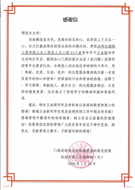 水利与建筑工程院收到来自门源县新型冠状病毒感染的肺炎疫情防控处置工作指挥部的一封感谢信。