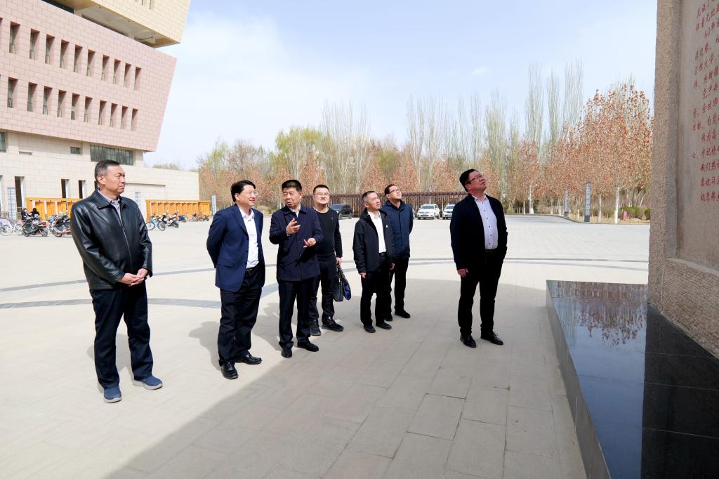 王磊一行在赵光辉等陪同下考察了新时代广场、红色文化广场、在建体育馆、新校区等建设情况。赵光辉欢迎王磊一行的到来,感谢兵团党委给予我校工作的关心和帮助,介绍了学校办学特色和发展历史,希望兵团党委继续支持帮助塔大统筹扩大办学规模和高质量发展。