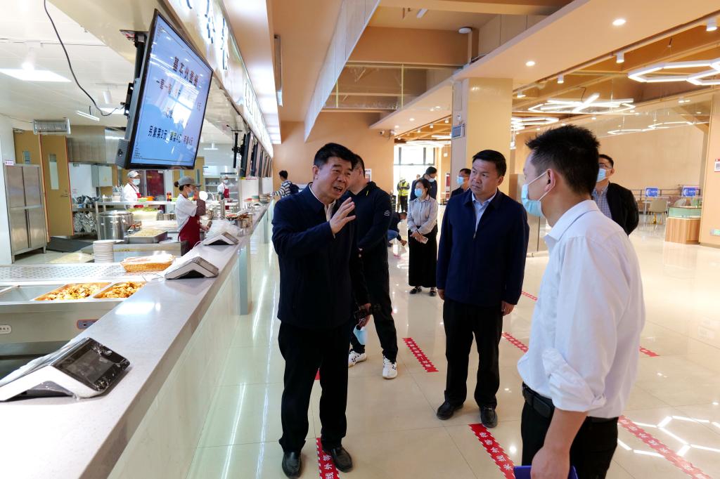 赵光辉来到新校区(东扩区)一期学生食堂,仔细查看窗口菜品、价格质量、就餐环境等,深入了解原料采购、环境消杀、餐饮卫生、学生消费等情况。要求进一步强化责任意识,以师生满意度为工作方向,确保食堂饭菜品种多样、营养丰富、质量可靠、价格合理,用高质量的服务,为师生营造良好的就餐环境。