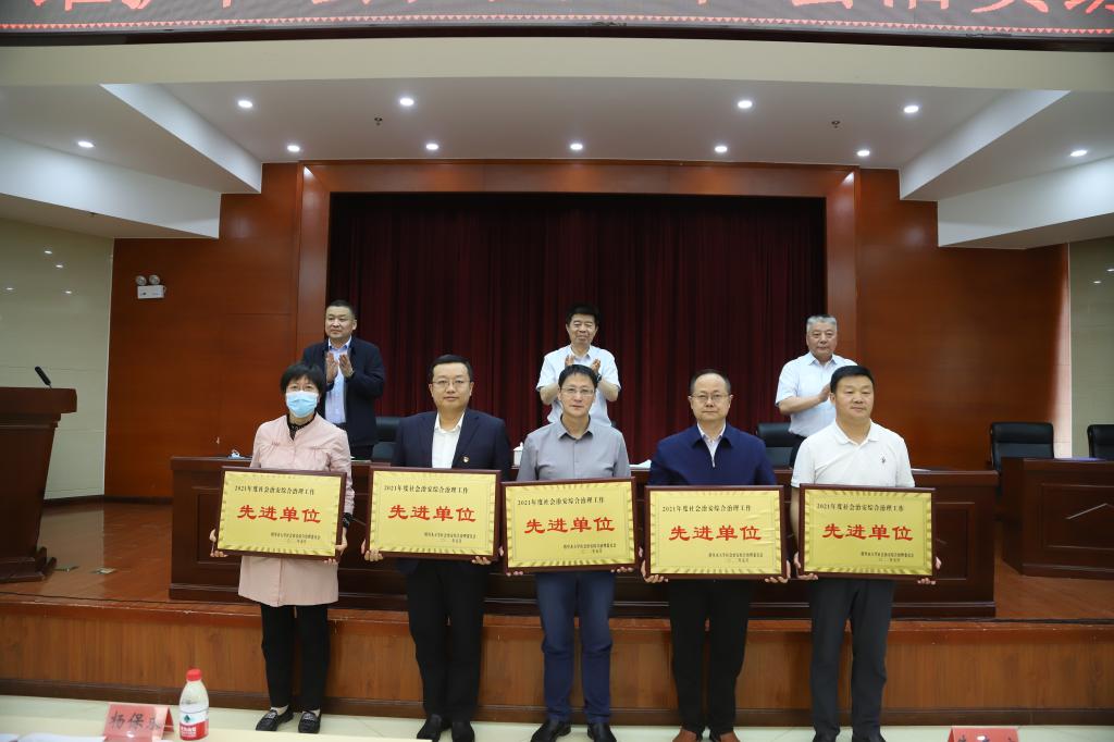 单洪山宣读了《关于表彰2021年度学校社会治安综合治理工作先进单位及先进个人的决定》。与会校领导为先进单位进行了颁奖。石长青作了题为“全面提升社会治理现代化水平 奋力开创新时代综合治理新局面”的学校2022年维稳综治工作报告。