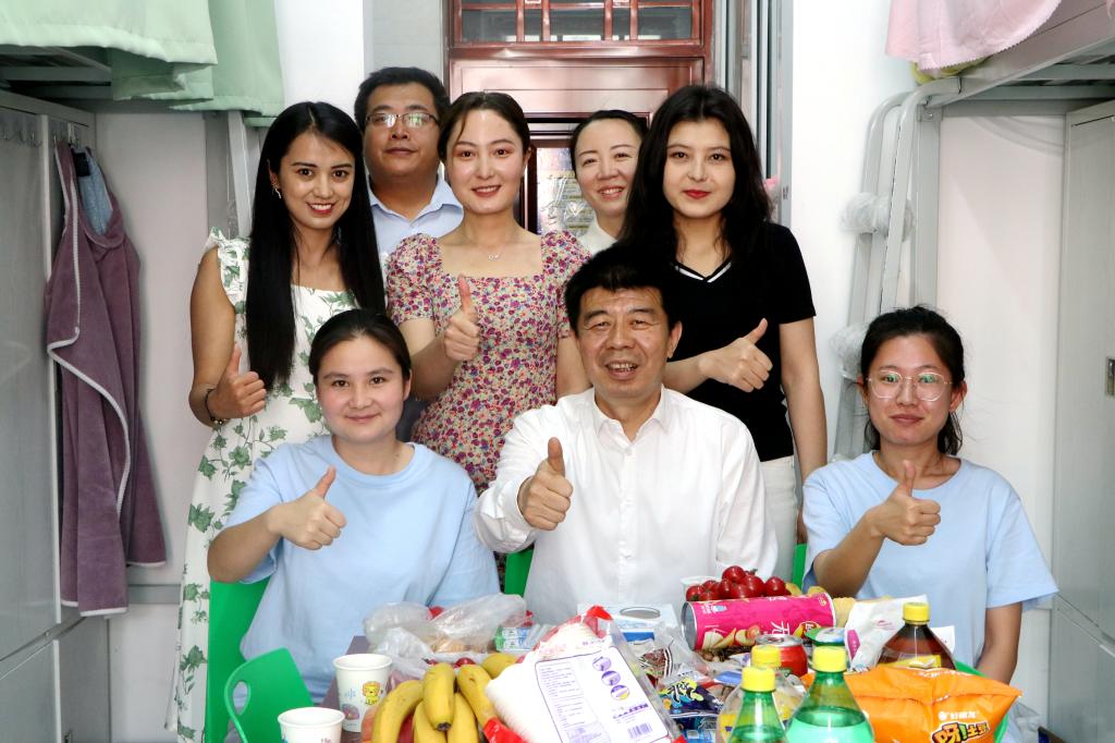 5月3日上午,在肉孜节之际,党委书记赵光辉,党委副书记、校长张爱萍,党委副书记、纪委书记单洪山,副校长张利莉,党委常委、副校长于军、石长青分成六个组,看望慰问交友学生、教职工代表和一线工作人员。