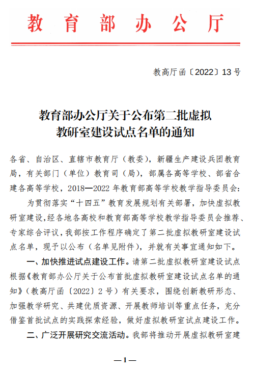 虚拟教研室是信息化时代新型基层教学组织建设的重要探索,此次评选是为贯彻落实“十四五”教育发展规划有关部署,加快虚拟教研室建设,经各地各高校和教育部高等学校教学指导委员会推荐、专家评议,教育部选拔出的虚拟实验室建设试点。