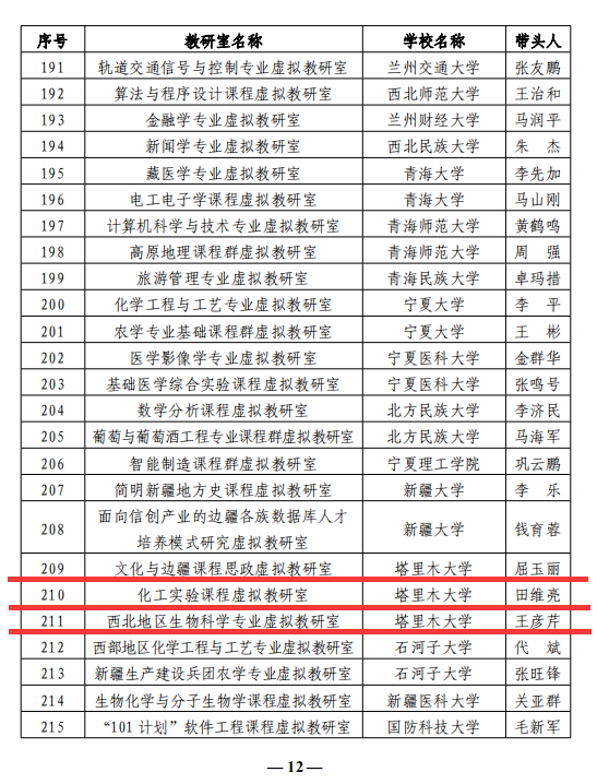 近日,教育部公布了第二批虚拟教研室建设试点名单,我校人文学院屈玉丽教授带领的“文化与边疆课程思政虚拟教研室”、化学化工学院田维亮教授带领的“化工实验课程虚拟教研室”、生命科学与技术学院王彦芹教授带领的“西北地区生物科学专业虚拟教研室”成功获批立项。