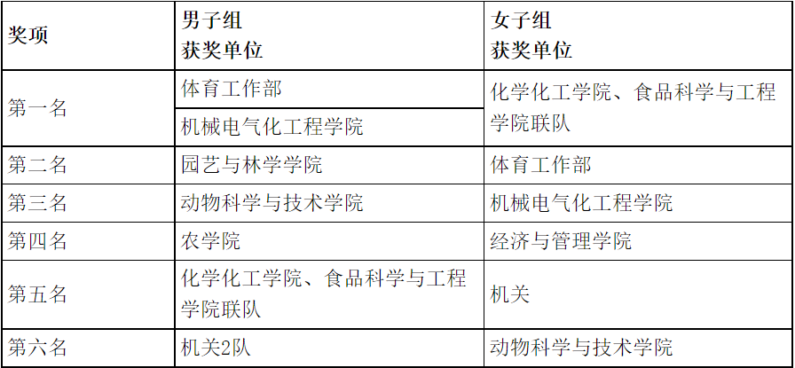 经过激烈角逐,体育工作部代表队、机电院代表队分获教职工排球比赛男子组第一名,化工院、食科院联队获得教职工排球比赛女子组第一名。具体获奖情况见表:
