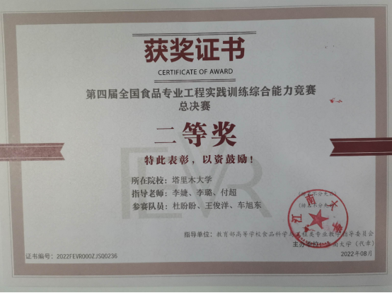 近日,第四届全国食品专业工程实践训练综合能力竞赛(总决赛)在西南大学落下帷幕。我校食品专业杜盼盼、王俊洋、车旭东三名同学在总决赛中荣获二等奖。