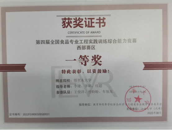 自5月份以来,经过校赛选拔后,三名同学在食品科学与工程学院李婕、付超、李璐三位老师指导下,积极备赛、团结协作、攻坚克难,在西部赛区的激烈角逐中脱颖而出,斩获一等奖,又顺利拿下国赛的邀请函。