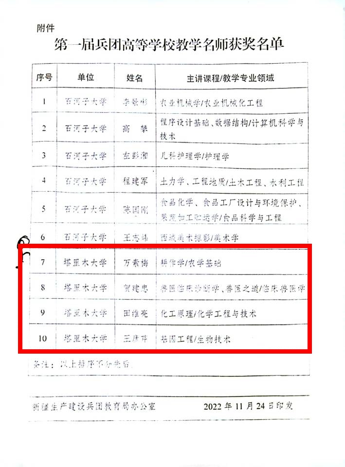 近日,兵团教育局公布了第一届兵团高等学校教学名师获奖名单。我校农学院万素梅教授、动物科学与技术学院贺建忠教授、化学化工学院田维亮教授、生命科学与技术学院王彦芹教授喜获第一届兵团高等学校教学名师。至此,学校获省级教学名师人数累计达到9名。