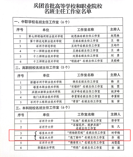 近日,兵团教育局《关于公布兵团首批高等学校和职业院校名班主任工作室名单的通知》(兵教函[2022]61号),对17个获得兵团首批高等学校和职业院校名班主任工作室予以公布。我校园艺与林学学院班主任时学梅、动物科学与技术学院班主任齐萌喜获立项。