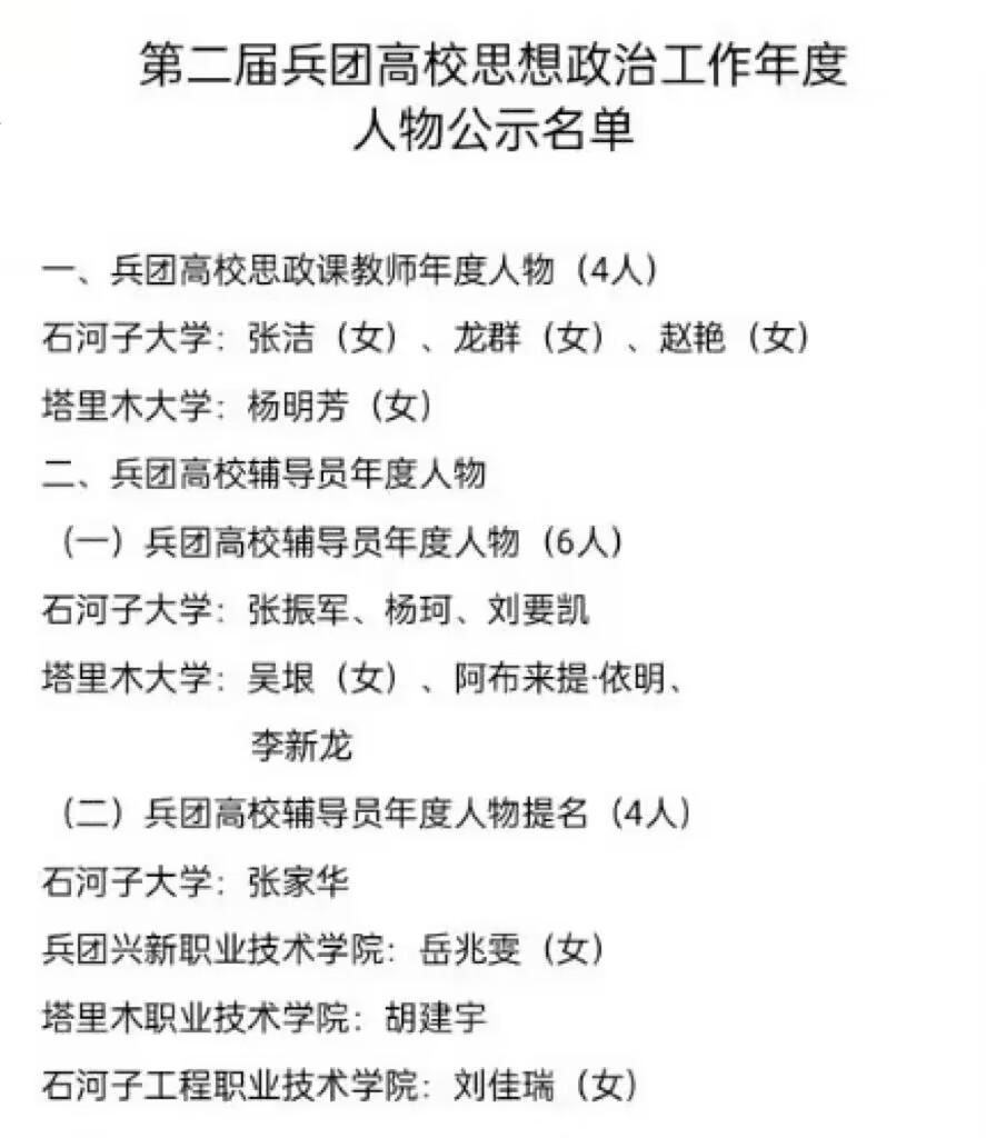 本次评选活动旨在深入学习贯彻习近平新时代中国特色社会主义思想,选树培养思想政治工作先进典型,展示思政课教师、辅导员队伍建设成果,推进思想政治工作队伍的专业化、职业化建设。经学校选拔推荐、教育局组织专家评审、评选结果公示等环节,共推选出第二届兵团“高校思政课教师年度人物”4人;“高校辅导员年度人物”6人;“高校辅导员年度人物提名”4人。