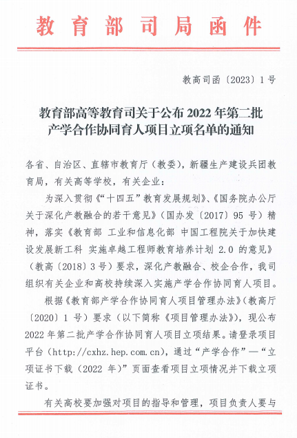 近日,教育部下发《教育部高等教育司关于公布2022年第二批产学合作协同育人项目立项名单的通知》(教高司函〔2023〕1号),我校“法学智能一体化虚拟仿真教学实验室建设”等6个项目获批立项。