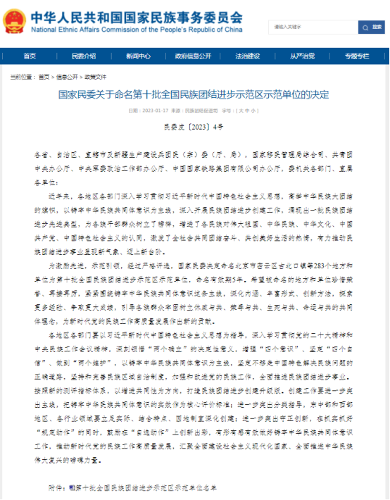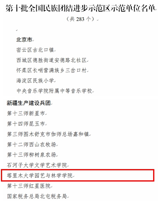 近日,国家民委发布了《关于命名第十批全国民族团结进步示范区示范单位的决定》,命名283个地区、单位为第十批全国民族团结进步示范区示范单位,我校园艺与林学学院入选其中。