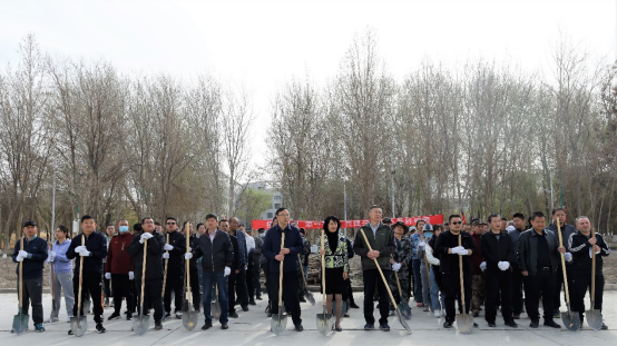 植树现场,三五人为一组挖坑铲土,栽植树苗、扶正树苗,挥锹培土,浇水施肥,配合默契,大家干劲十足,现场呈现一派热火朝天的景象。