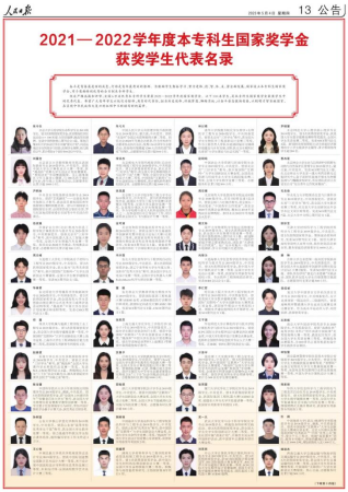 自2016年开始,《人民日报》每年5月4日都会推出“本专科国家奖学金获奖学生代表名录”百人榜。奋斗是青春最亮丽的底色,行动是青年最有效的磨砺。国家设立本专科生国家奖学金旨在奖励优秀全日制本专科学生,激励广大青年学子勤奋学习、积极进取,努力成为德智体美劳全面发展的堪当民族复兴重任的时代新人。经严格选拔和评审,全国6万名优秀本专科学生荣获2021-2022学年度国家奖学金,我校共有30名本科学生荣获国家奖学金。
