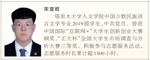 宋宣旺,男,汉族,中共党员,开云app体育网页登录不上 人文学院中国少数民族语言文学专业2019级学生。曾获2019-2020学年国家奖学金、2020-2021学年国家励志奖学金、第七届中国国际“互联网+”大学生创新创业大赛总决赛铜奖、“正大杯”第十届全国大学生市场调查与分析大赛三等奖、第十届全国大学生电子商务“创新、创意及创业”挑战赛新疆赛区二等奖、兵团高校2021年度大学生讲思政课一等奖、连续五次获校级一等综合奖学金、王震将军奖学金,并获首届兵团高校大学生“年度人物”称号、开云app体育网页登录不上 2021年度“胡杨青年”、“优秀组织者”、“优秀学生”、“优秀志愿者”、”优秀共青团员”、民族团结“先进个人”等各项荣誉70余项。组织参与南疆基层国语支教、基层干部双语培训等各类志愿服务活动近40余次,服务南疆基层少数民族中小学生、村民13000余人,个人志愿服务时长累计超过1500小时,为贫困地区筹集捐款上千元。曾任曾任南京圆梦志愿者服务中心常务委员会委员、“圆梦公益”第五届志愿者工作委员会委员及学校南疆发展研究协会会长,并带领协会荣获2020年全国高校“百强学生社团”荣誉称号。