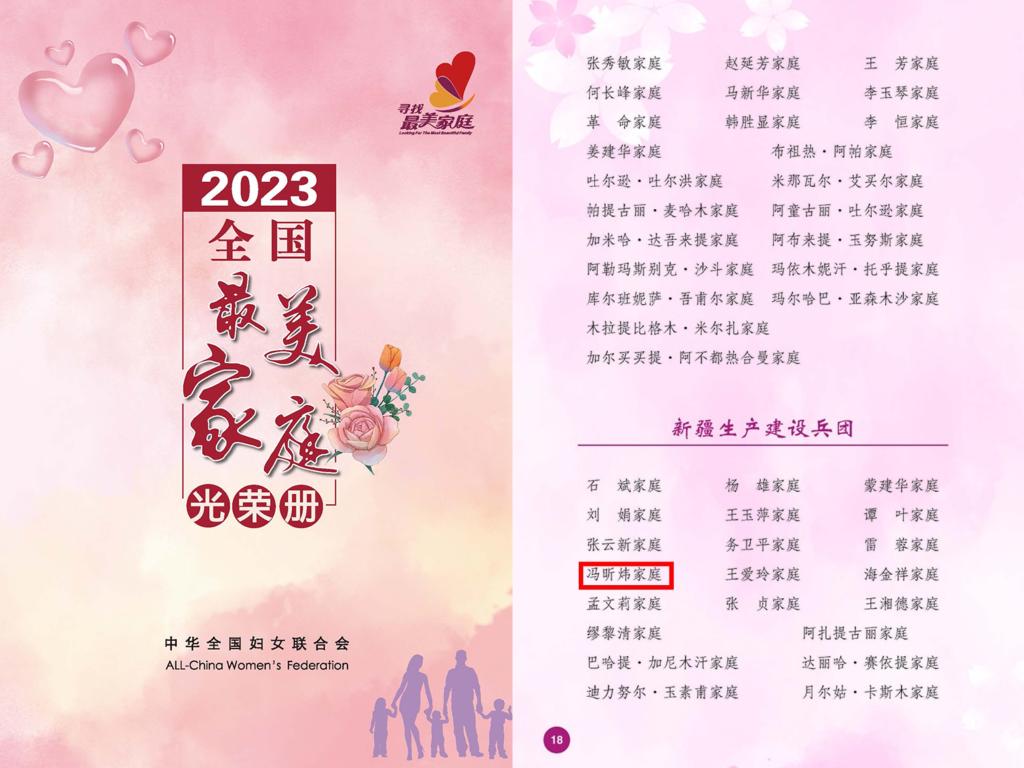 5.15国际家庭日前夕,全国妇联揭晓1000户全国最美家庭,我校冯昕炜、许贵善家庭荣获2023年全国最美家庭。兵团妇联揭晓54户兵团最美家庭,我校聂竹兰、魏杰家庭获2022年兵团最美家庭。